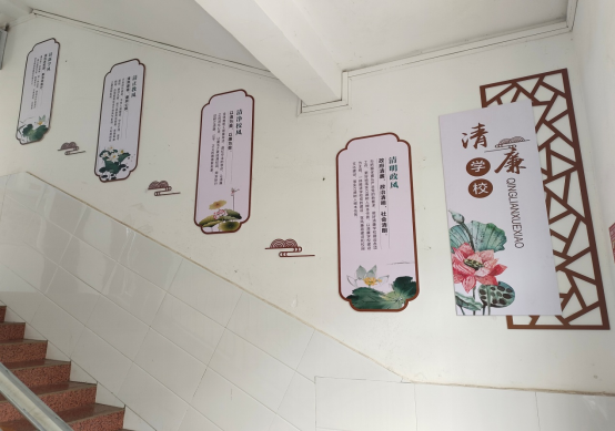 环境育人,潜移默化。依据实际,打造一班一真言,一廊一警示、一栏一主题。走进该校,可以看到校内走廊、围墙等装饰成了清廉文化宣传地,清廉标语、廉政故事等校内的每一处角落都在诠释大家共创廉洁校园的美好期盼,润物无声传进每一个师生心中。